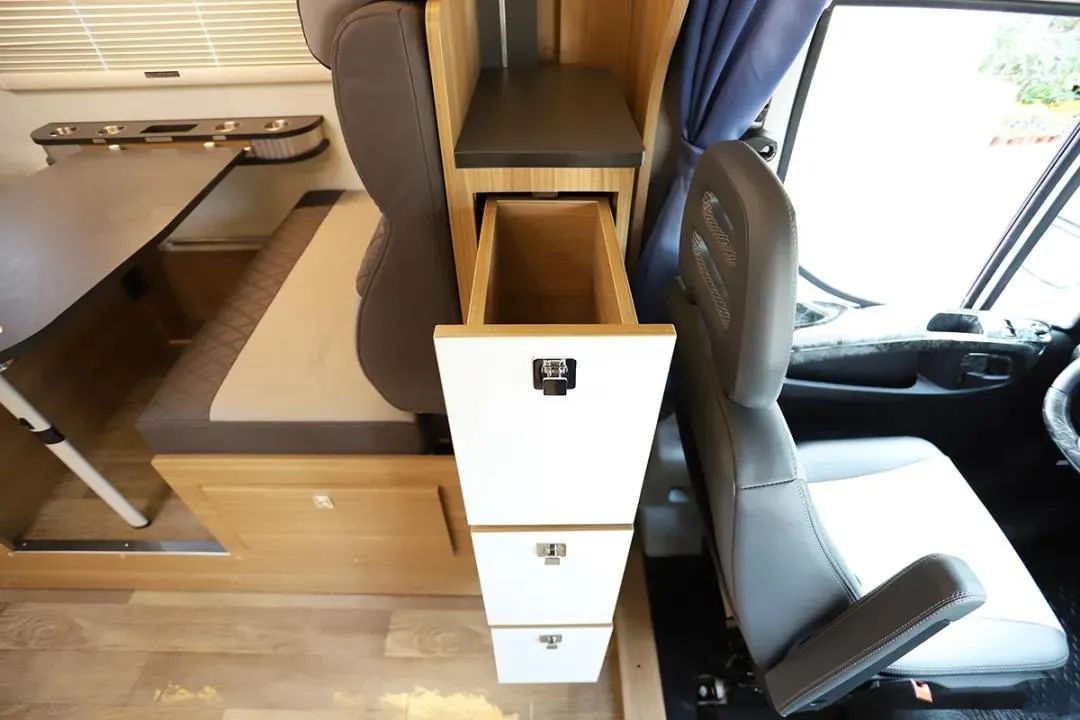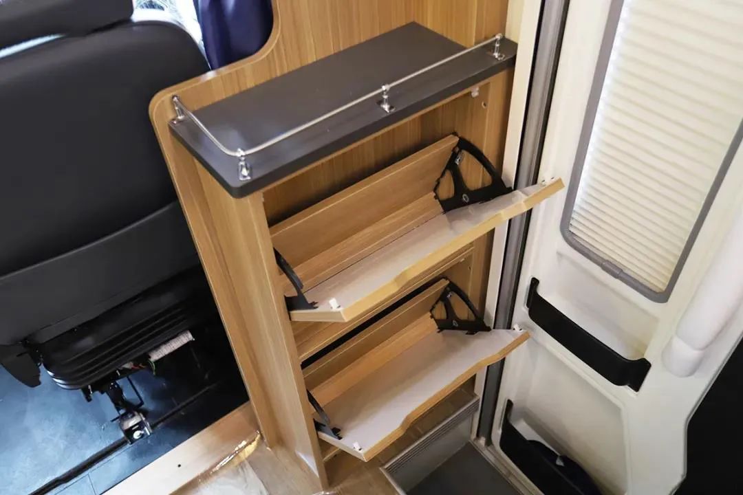 反向座椅與駕駛室的夾縫處有三組儲物抽屜,上方還有一小塊置物臺,布局方式與國產(chǎn)底盤(pán)版本相同。