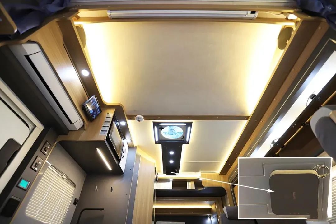 車(chē)門(mén)上方裝配了富士通變頻空調,外部覆蓋了與內飾相同的淺木質(zhì)板材,外掛的屏幕被用作6路監控顯示器。