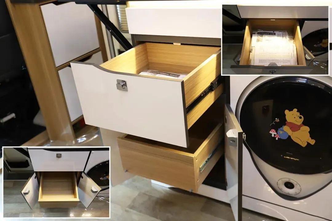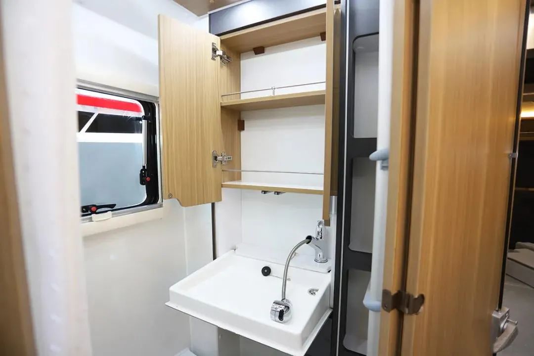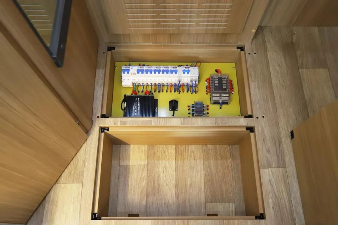 在后床地臺位置開(kāi)設了儲物格和電路保險盒,同時(shí)床鋪內部置有50升史密斯家用電熱水器,柜門(mén)進(jìn)行了打孔處理便于機器散熱,是國產(chǎn)底盤(pán)版本的小升級。