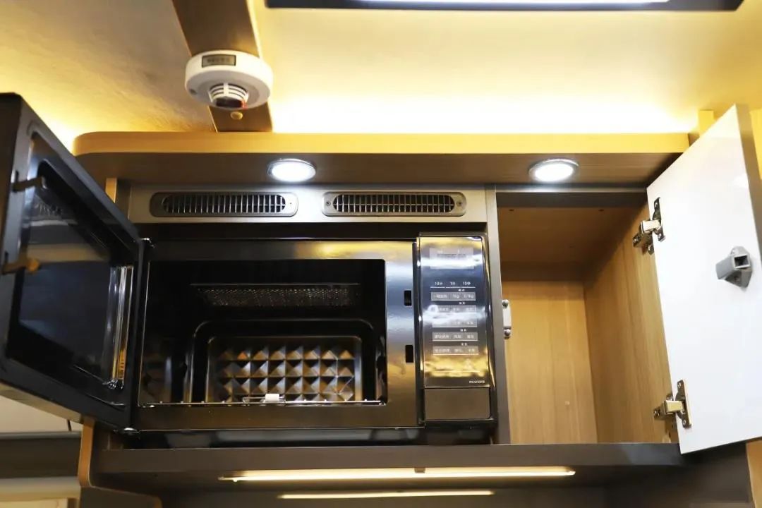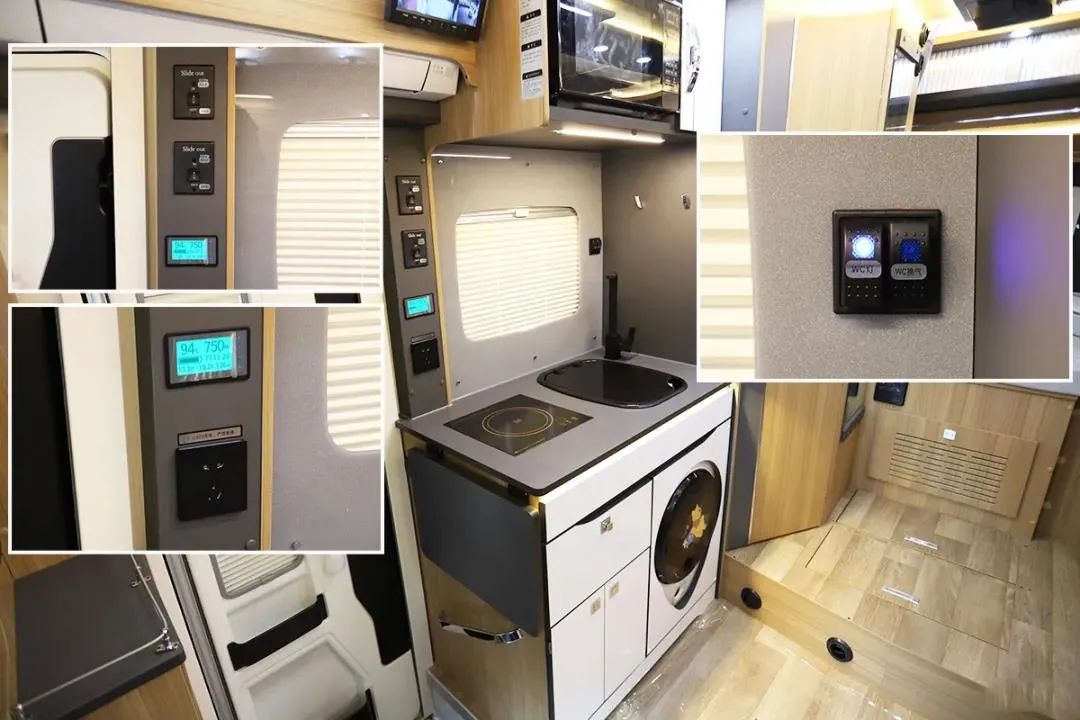 車(chē)門(mén)后方即為廚房區域,在正式介紹前,我們先來(lái)看看附近的控制按鈕:首先兩扇拓展艙按鈕放置在廚房墻壁上,用戶(hù)進(jìn)門(mén)可以直接使用。下方屏幕用來(lái)顯示電量比例,下方的電源接口也能連接外展電器。衛浴間燈光和換氣扇開(kāi)關(guān)在廚房右側。