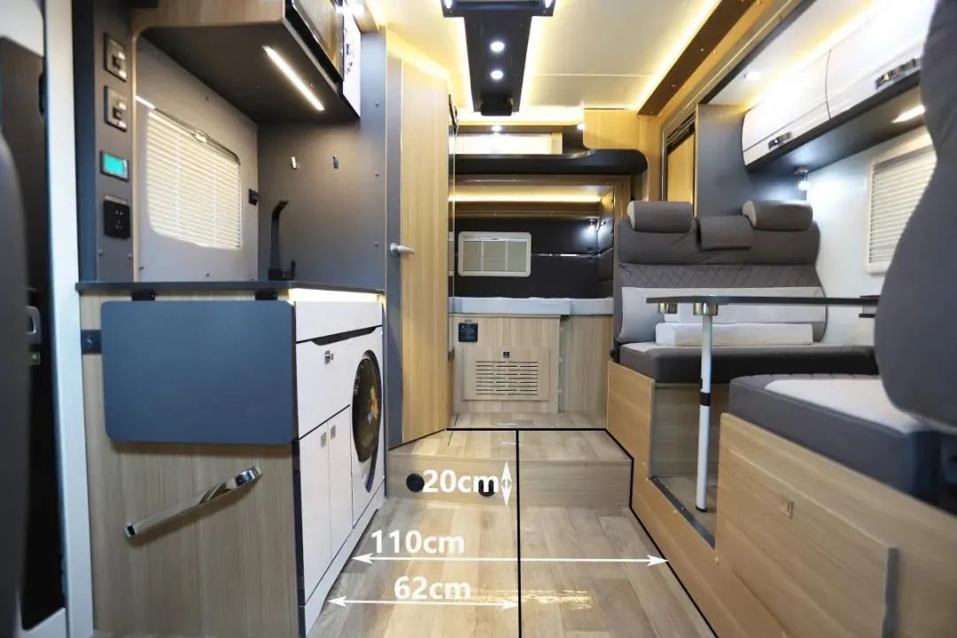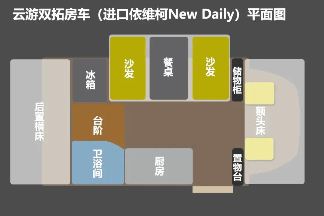 云游雙拓的生活區由額頭床、會(huì )客區、廚房、衛生間、尾置橫床組成,其中尾置床與會(huì )客區為拓展區域,經(jīng)過(guò)實(shí)測會(huì )客區可向外延伸約48cm寬度,最終形成110cm的客廳。