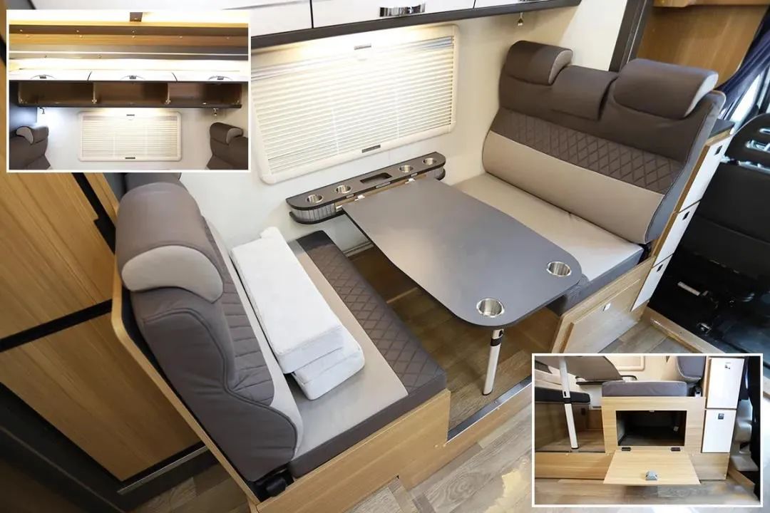 對座沙發(fā)采用科技布+科技皮材質(zhì),避免了皮革座椅冬涼夏熱的問(wèn)題。舒適性表現上,我們可以看到沙發(fā)靠背鼓起的靠墊,顯然對乘客的腰部支撐更為友善。在配置方面,座椅下部配有電源接口,頂部有單獨開(kāi)閉的閱讀燈,餐桌一側還有放置水杯、手機的凹槽,避免駕駛過(guò)程中物品有滑動(dòng)掉落的風(fēng)險。