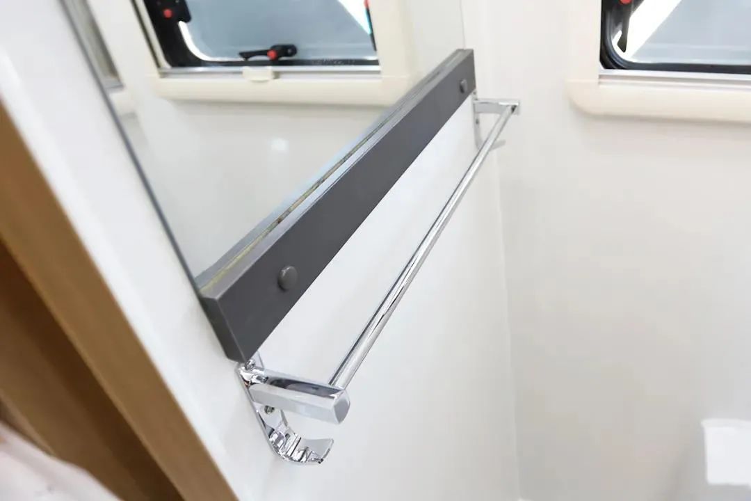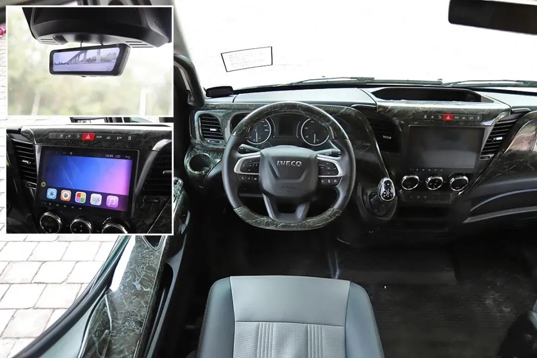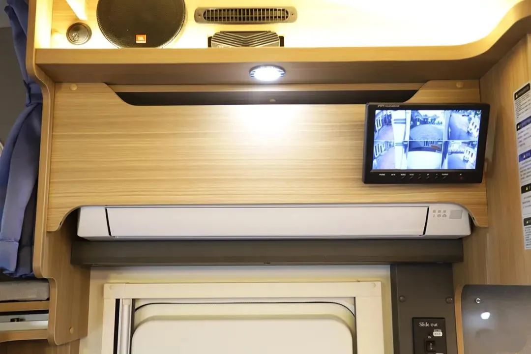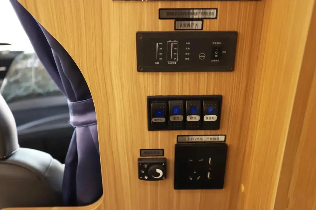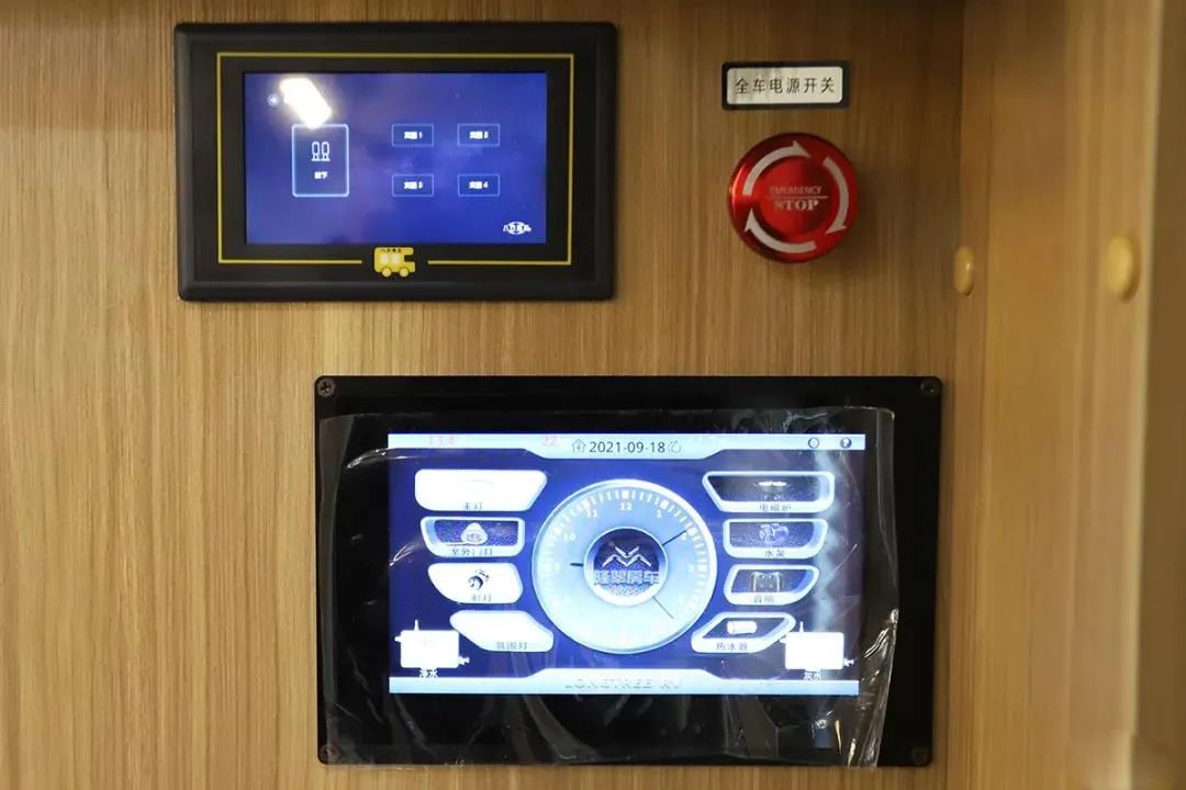 整車(chē)的信息顯示、總控區域在生活區右側,圖片所示的分別是電動(dòng)支腿控制屏幕、車(chē)輛信息顯示及總電源開(kāi)關(guān),有意思的是電源開(kāi)關(guān)包裝成了類(lèi)似性能車(chē)啟停按鈕,實(shí)際操作為旋轉方式,使用方便而且旋轉質(zhì)感也不錯。