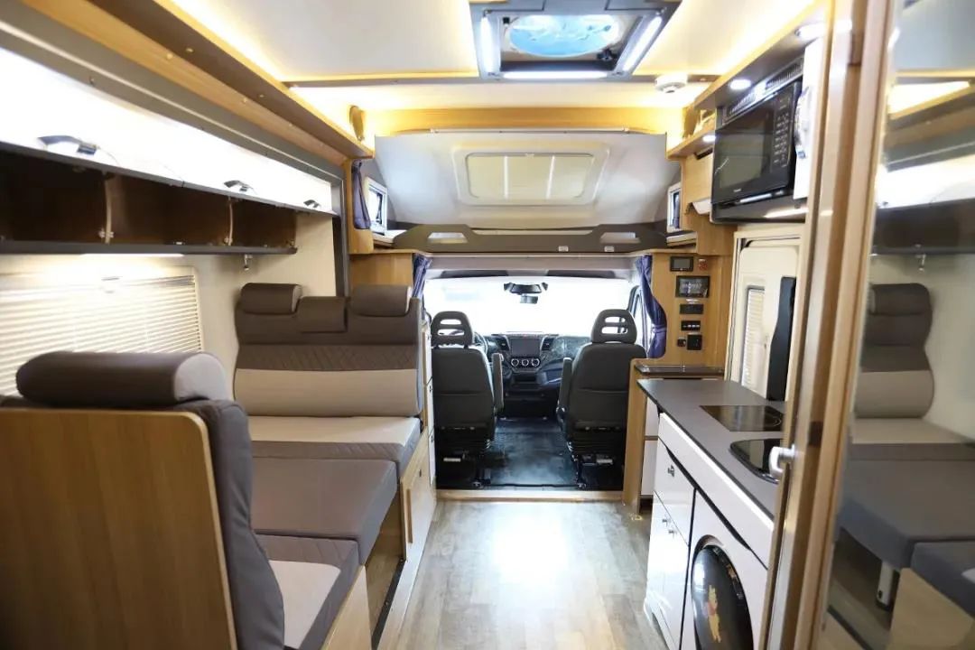 新車(chē)采用日系房車(chē)的設計風(fēng)格,主要表現為:深灰色沙發(fā)包覆面和深灰色家具飾板搭配白兩色光源,大部分家具飾面還是以原木風(fēng)格為主色調。地板為木質(zhì)地板革,且內部板材可以達到E0級環(huán)保板材標準。