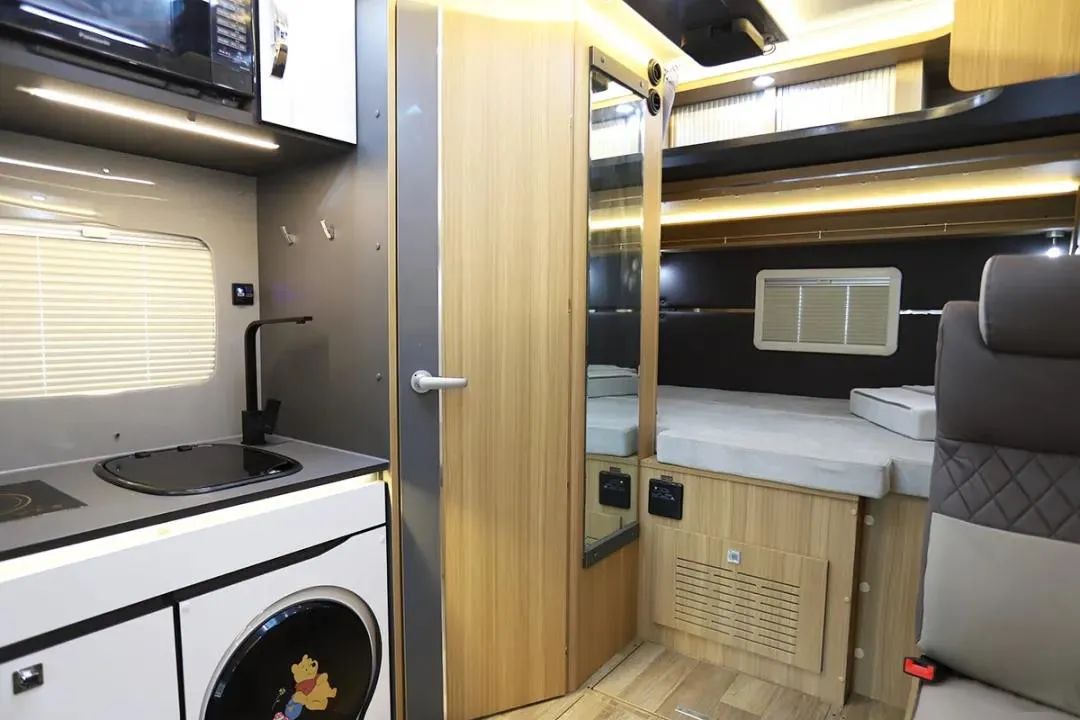 拓展艙部分的墻體進(jìn)行了黑色軟性材質(zhì)包裹,提升舒適性的同時(shí)又能突出質(zhì)感。在配置上,后橫床配有閱讀燈、電源插座等。水電路方面,云游雙拓配有200L凈水箱、60L灰水箱,無(wú)論是洗衣機用水還是廚房、衛浴間用水,依然可以滿(mǎn)足用戶(hù)幾天訴求。此外800Ah鋰電池、800W太陽(yáng)能、3000W拓寶逆變器將作為車(chē)內儲能配置。
