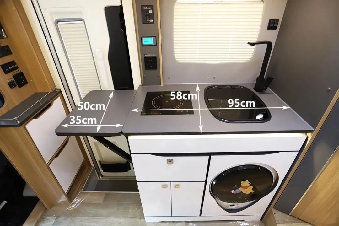 經(jīng)過(guò)實(shí)測,廚房區域的主臺面尺寸可以達到58x95(cm),內嵌電磁爐及賽特福德帶蓋洗手池,為迎合車(chē)內偏日系的生活氛圍,水龍頭和蓋板進(jìn)行了黑化處理。主臺面右側可拓展一張35x50(cm)的置物臺,進(jìn)一步擴大了廚房操作面積,同時(shí)也會(huì )提升用戶(hù)參與感。