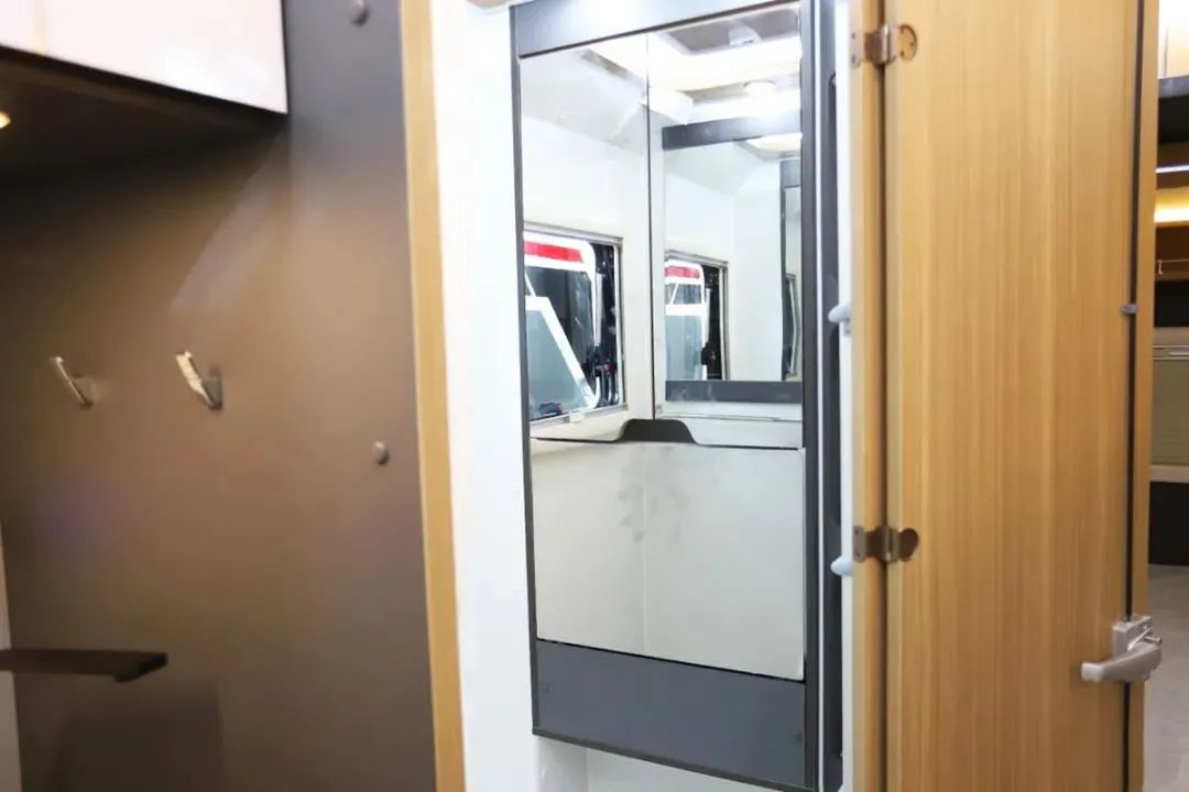 儲物方面,正向配有頂柜,正對的兩個(gè)儲物柜還有軌道滑動(dòng)柜門(mén),有利于用戶(hù)放置私人物品。