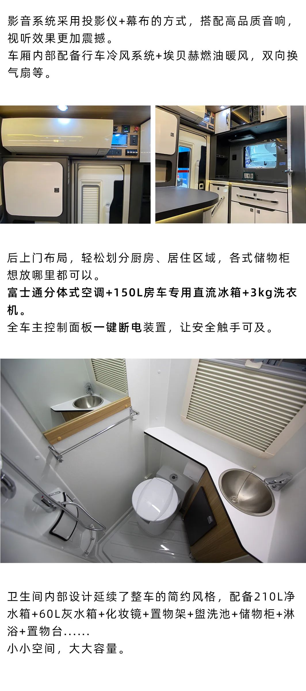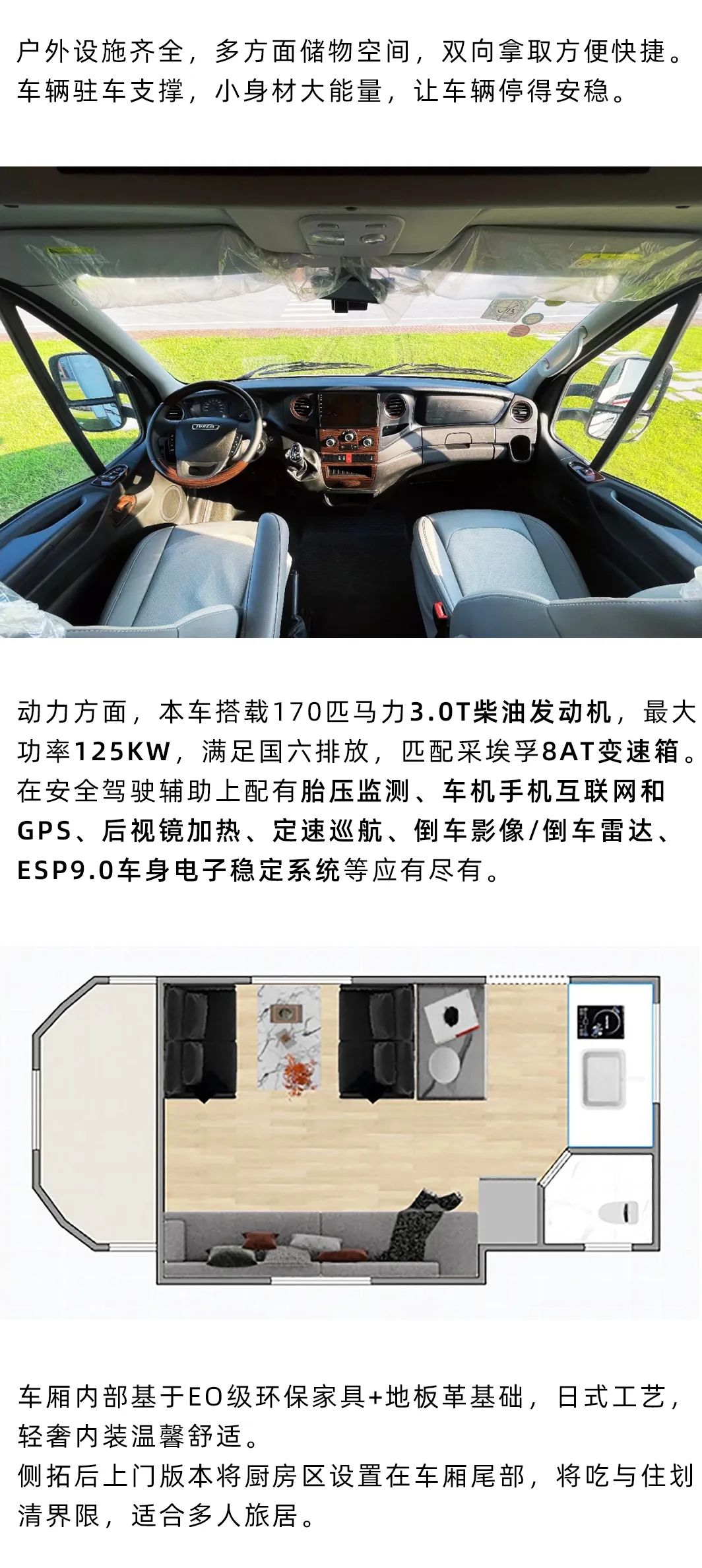 本車(chē)采用了新款的國產(chǎn)依維柯Daily底盤(pán)打造,該底盤(pán)專(zhuān)為房車(chē)使用打造,配備有加寬后橋,讓車(chē)輛的行駛過(guò)程更加穩定。后橋雙胎布置也讓其承載能力更強。車(chē)廂采用了多層復合板材打造,表面更平整,視覺(jué)效果更光滑,同時(shí)還能帶來(lái)更強的保溫保暖表現。電器配置采用了12v100ah鋰電池、3000w充逆變一體機等設備。如果覺(jué)得續航不夠,還能選裝最高800ah的鋰電池以及800w太陽(yáng)能板等設備,靈活配置房車(chē)用途。